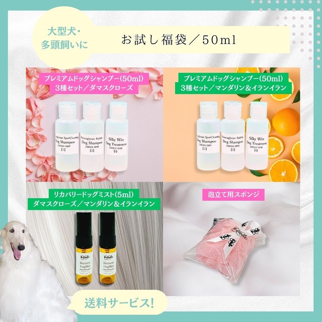 YULIX WISHES YOU A HAPPY NEW YEAR 2026 素敵な一年になりますように ユリックスより心を込めて === あけましておめでとうございます! ユリックスからの今年のお年玉は【お試し福袋】! 成分・配合をアップデートした【プレミアムドッグシャンプーシリーズ】から お客様からの好評を受け商品化した【リカバリードッグミスト】まで フルセットでお試しいただけるお得なセットです。 ★「ユリックスの香り」としてお馴染み 一番人気のマンダリン&イランイラン ★自然でラグジュアリーな香りがご好評 ダマスクローズ 是非使い比べてみてください! トリミングへの持ち込みや、ご旅行時のトラベルセットとしてもご利用いただけます。 犬友さんへのプレゼントにもオススメです! === 【お試し福袋/50ml】5,500円(税込+送料込) ★大型犬・多頭飼いにおすすめ。 ※掲載画像はイメージです。ボトルデザイン・スポンジの色や形が変更となる場合があります。 ※お試し用の簡易容器でのお届けとなります。3ヶ月以内に開封し、開封後はすぐに使い切ってください。 セット 内容: ・ユリックスプレミアムプロテオグリカンスポットクリーニングドッグシャンプー/ダマスクローズ(50ml) ・ユリックスプレミアムプロテオグリカンバブルドッグシャンプー/ダマスクローズ(50ml) ・ユリックスプレミアムシルキーウィンドッグトリートメント/ダマスクローズ(50ml) ・ユリックスプレミアムプロテオグリカンスポットクリーニングドッグシャンプー/ダマスクローズ(50ml) ・ユリックスプレミアムプロテオグリカンバブルドッグシャンプー/マンダリン&イランイラン(50ml) ・ユリックスプレミアムシルキーウィンドッグトリートメント/マンダリン&イランイラン(50ml) ・ユリックスリカバリードッグミスト/マンダリン&イランイラン(5ml) ・ユリックスリカバリードッグミスト/マンダリン&イランイラン(5ml) ・泡立て用スポンジ 【販売期間】2026年1月5日~ 【ご注意】在庫がなくなり次第、販売を終了いたします。