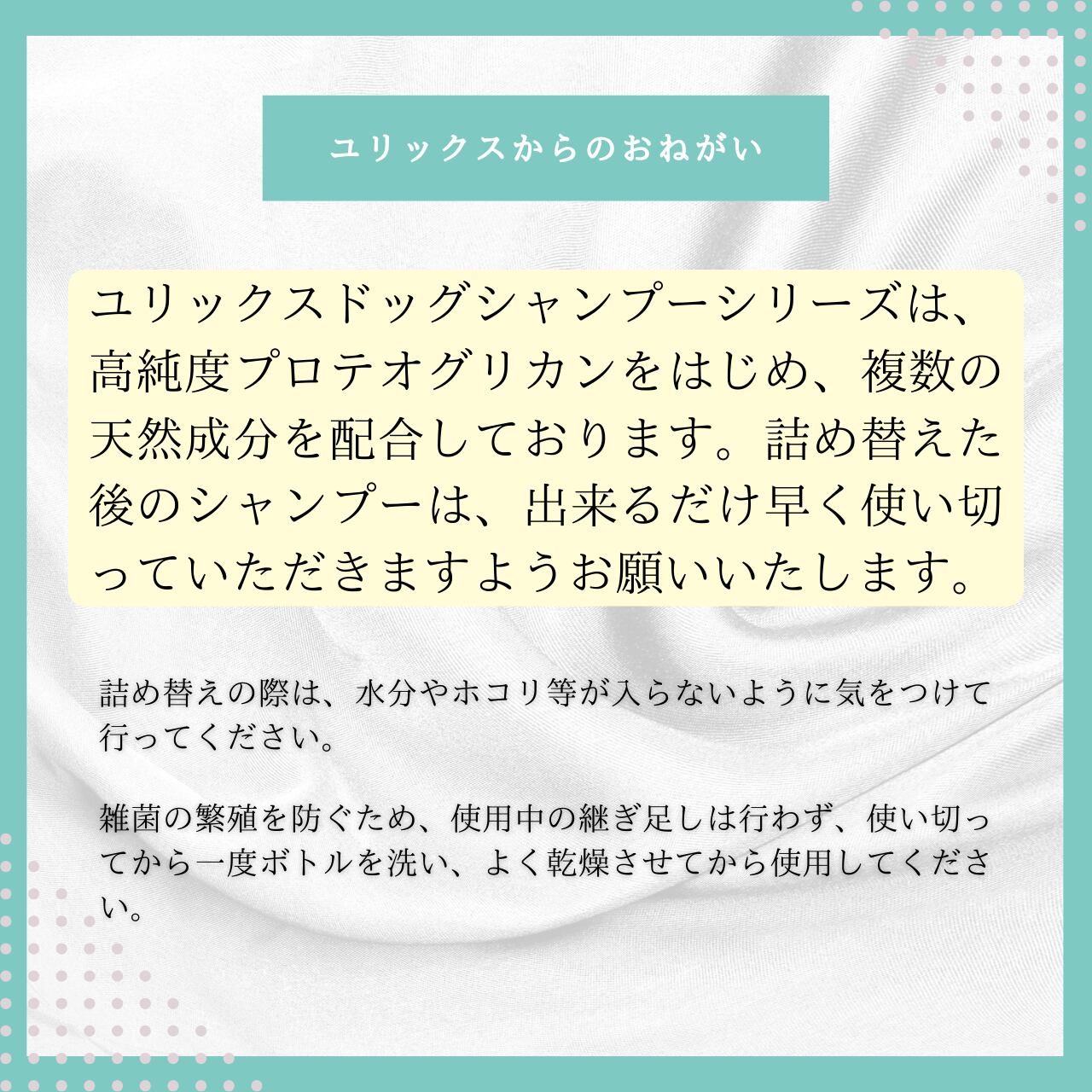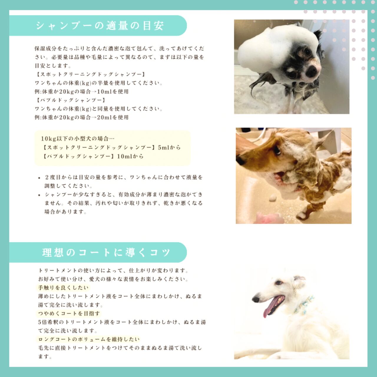 ※皮脂が気になるワンちゃんや汚れの強いワンちゃんには、『プロテオグリカンスポットクリーニングドッグシャンプー(別売)』の併用をお勧めいたします。