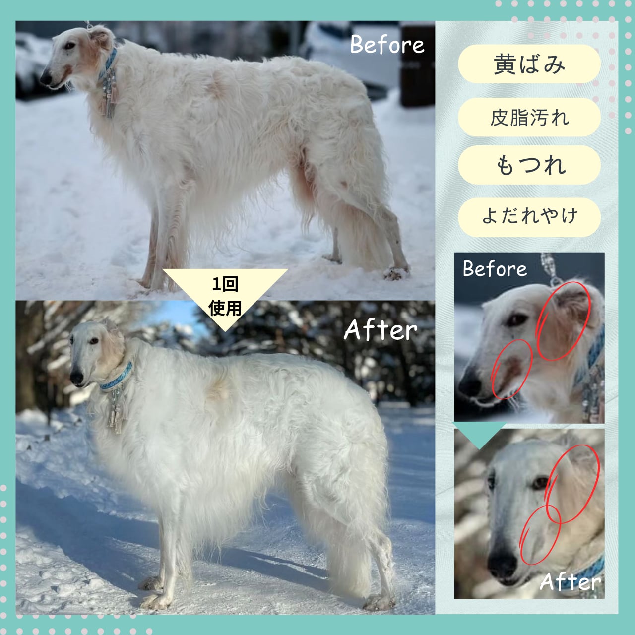 ※皮脂が気になるワンちゃんや汚れの強いワンちゃんには、『プロテオグリカンスポットクリーニングドッグシャンプー(別売)』の併用をお勧めいたします。