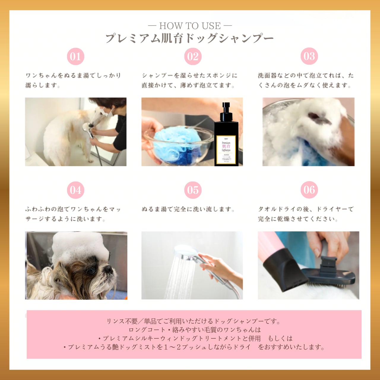 犬と洗う人の幸せを第一に考え、皮膚病に悩まない健やかな肌と被毛・臓器への負担軽減、時短をテーマに開発。